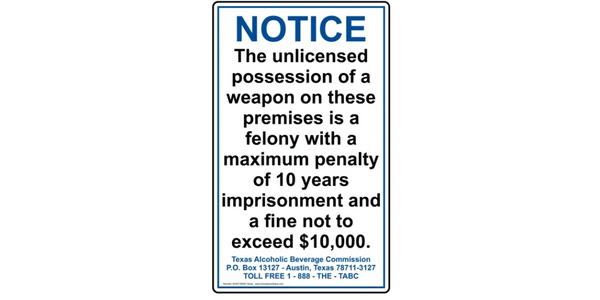 By obtaining your License to carry, not only will you learn the Texas State Penal Codes, proper handling of a firearm, non-violent dispute resolution, proper firearm storage, and the most important, FIREARM SAFETY RULES. You will also learn that there are many places that have this sign posted by TABC --->(Texas Alcohol and Beverage Commission) wherever alcohol is sold not for consumption on premise (Walmart, convenience stores, etc.). It is one of the most common warning signs posted TABC in Texas. Without a LTC, entering one of these establishments, carrying a weapon IS A FELONY.